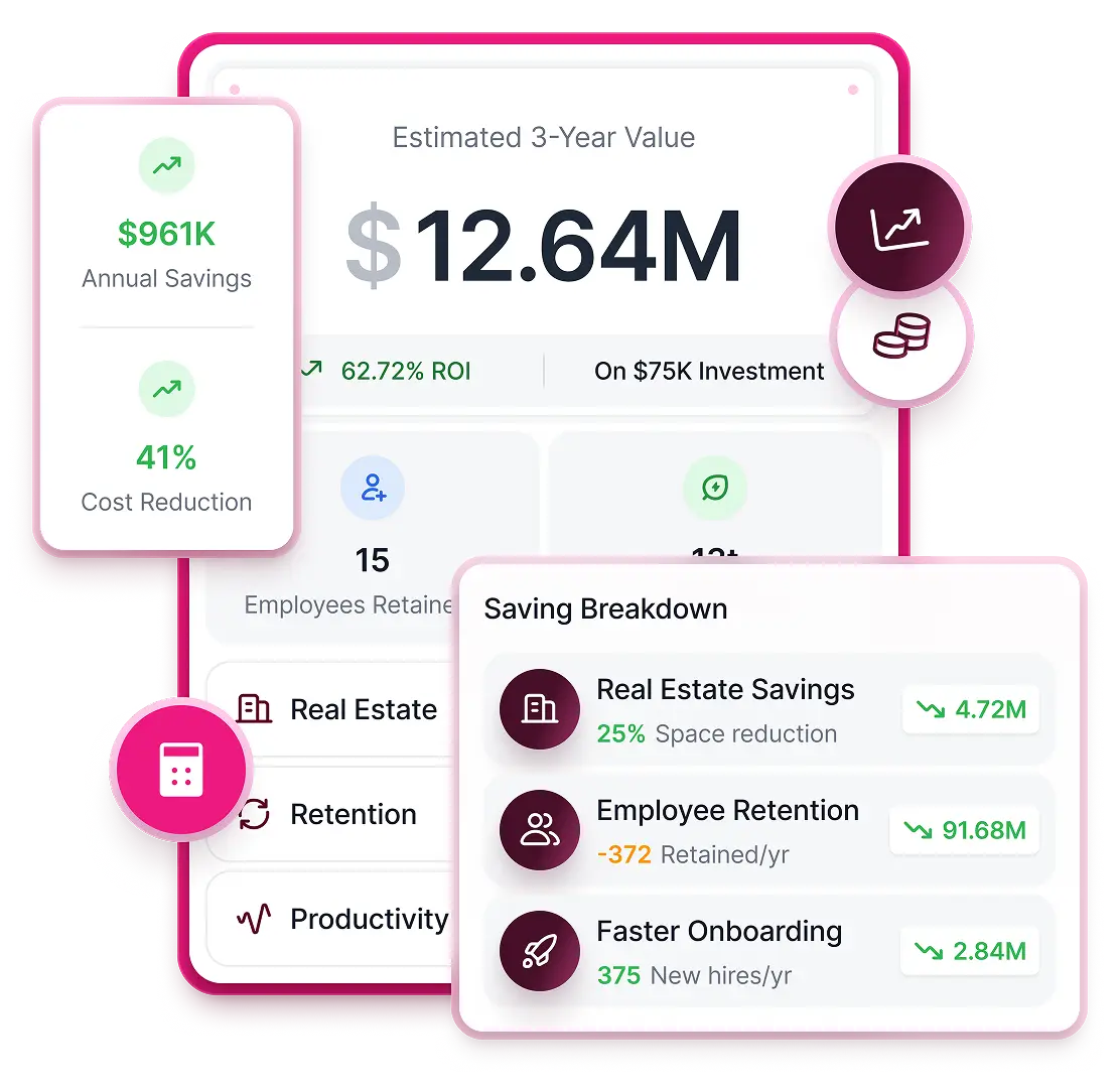 The ROI Calculator connects these variables into a structured financial model built on your organization’s data. It enables workplace leaders to present a clear, quantified business case aligned to enterprise performance priorities.