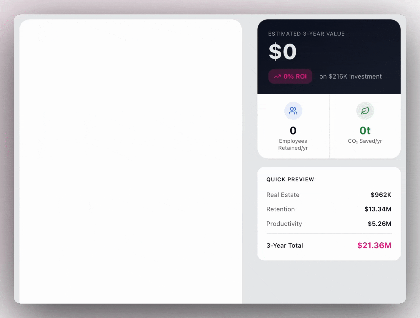 Using this information, the calculator models potential savings tied directly to improved space utilization and footprint optimization. The outputs reflect your actual lease commitments, ensuring that projections remain grounded in real cost exposure.