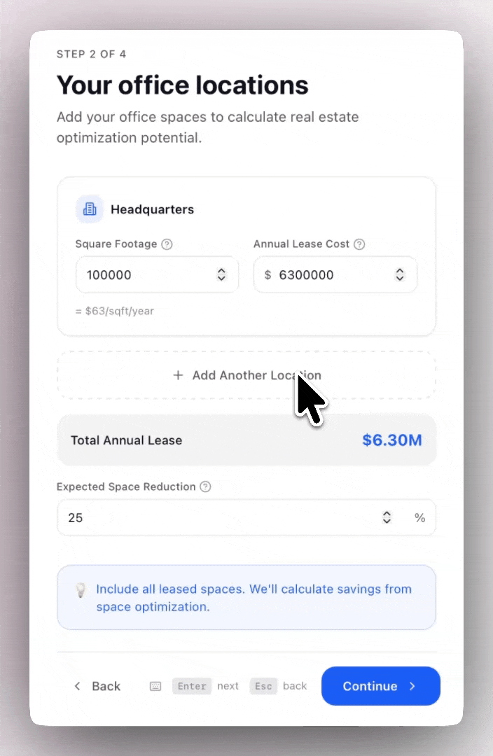 Next, you input square footage and annual lease cost for each office location, along with an anticipated space reduction percentage.