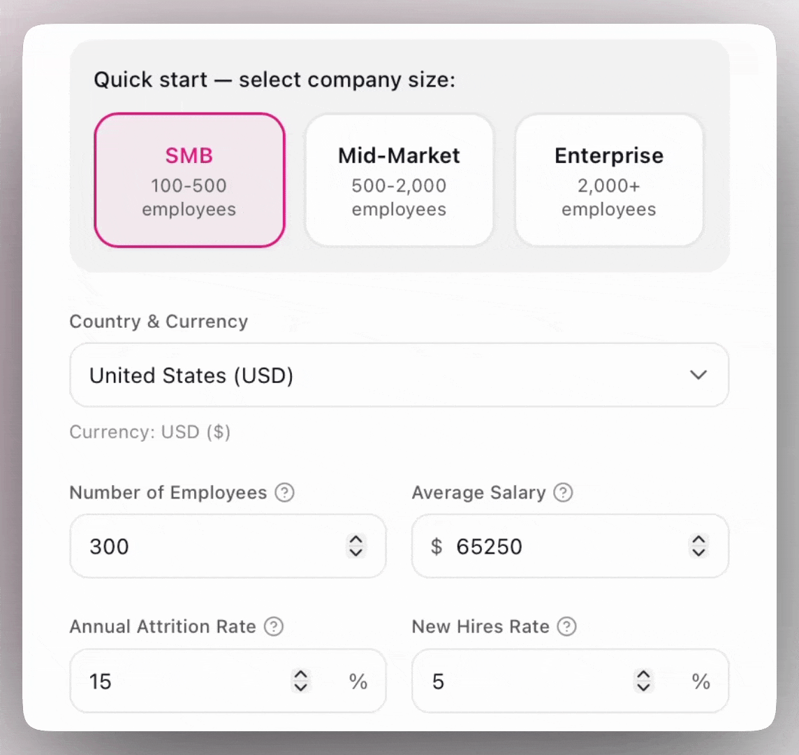 These inputs allow the model to calculate projected financial impact across reduced employee turnover, faster onboarding cycles, and productivity improvement. Because workforce expense represents one of the largest operating costs in most organizations, even modest improvements create meaningful financial value over a three-year period.