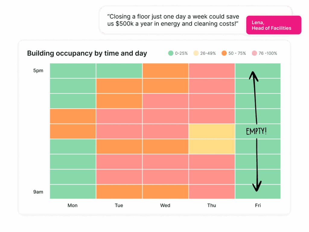This is where many right-sizing efforts stall. Without understanding who is using space, when they are using it, and for what type of work, utilization metrics create uncertainty rather than clarity.
