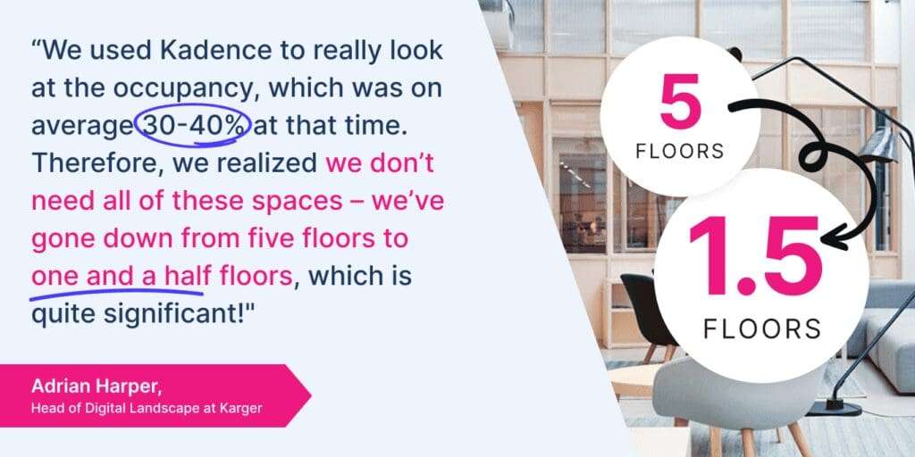 At Karger, a global publishing company, leaders wanted to reassess their office footprint without undermining how teams collaborated. By analysing real occupancy and booking data with Kadence, Karger could see which spaces were consistently underused and which moments truly mattered. That insight gave them the confidence to reduce their office space by 80 percent while continuing to support flexible and collaborative ways of working.