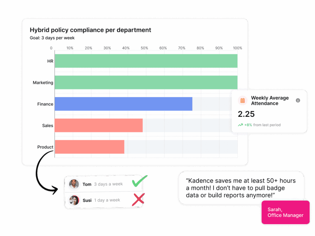 By combining attendance signals, desk and room bookings, and real usage patterns, Kadence helps organizations understand how space is actually being used across days, teams, and locations. Leaders can see peak demand, identify persistent underuse, and track how patterns change over time.