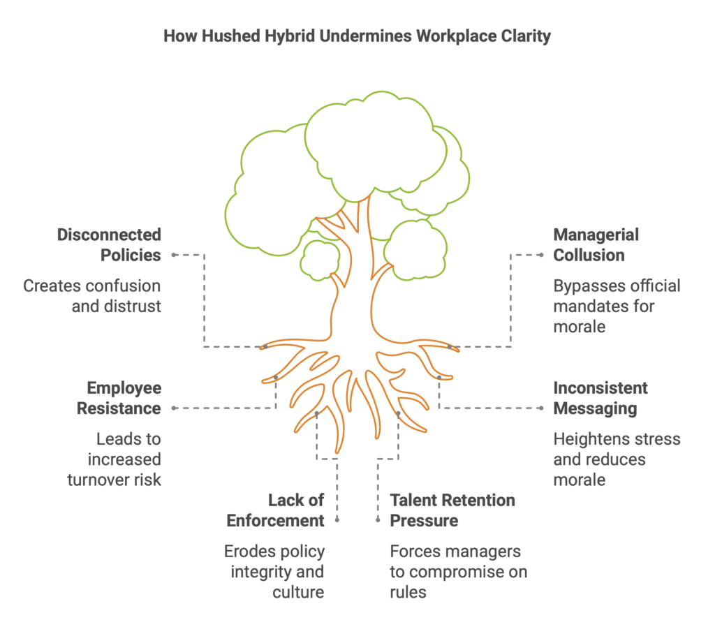 This is where hushed hybrid takes hold. The C-suite says one thing. Team leads do another. And employees are left navigating the gap.