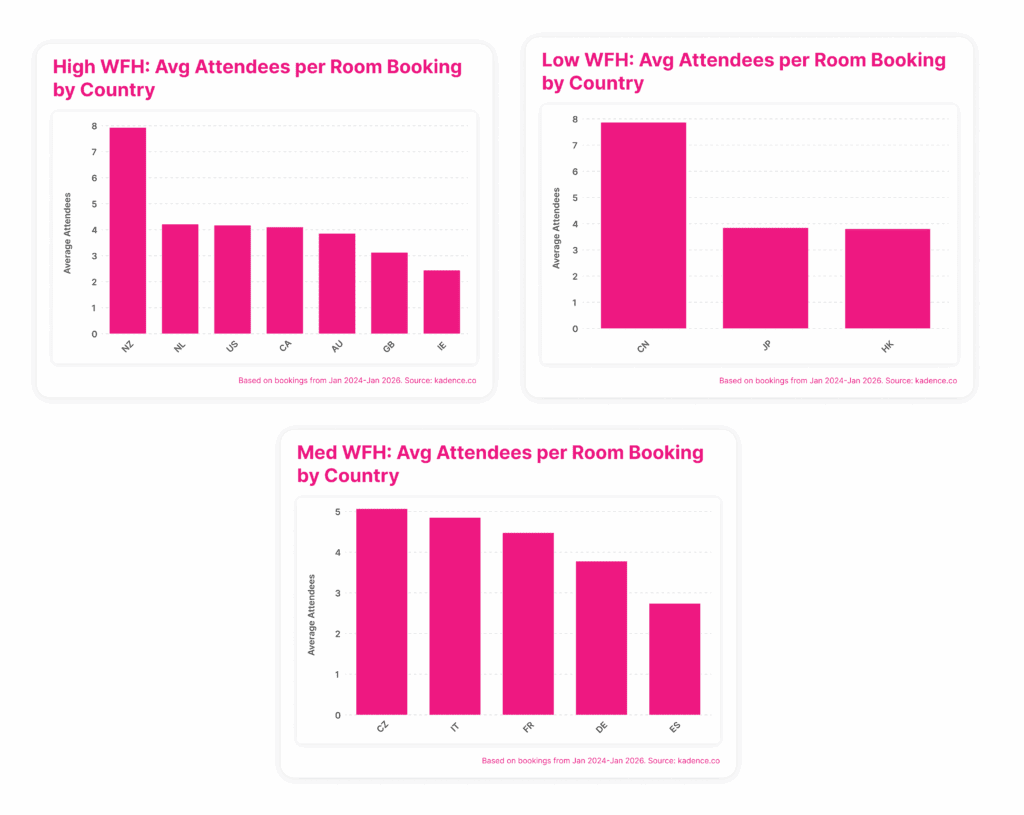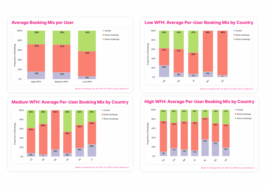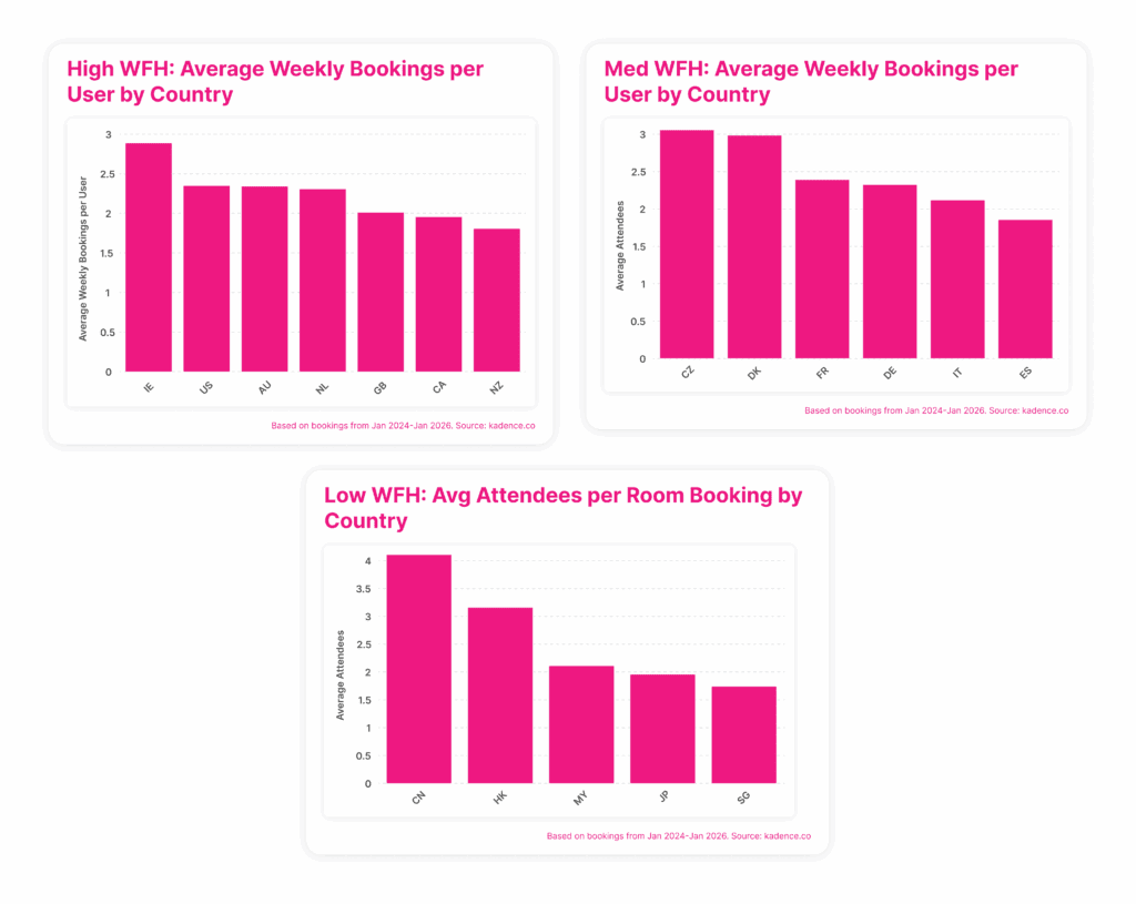 Room bookings also remain remarkably consistent across groups. They account for 28 percent of bookings in high work-from-home countries, 29 percent in medium work-from-home countries, and rise to 42 percent in low work-from-home countries. Even where attendance is higher, the balance between individual and collaborative space does not fundamentally change.