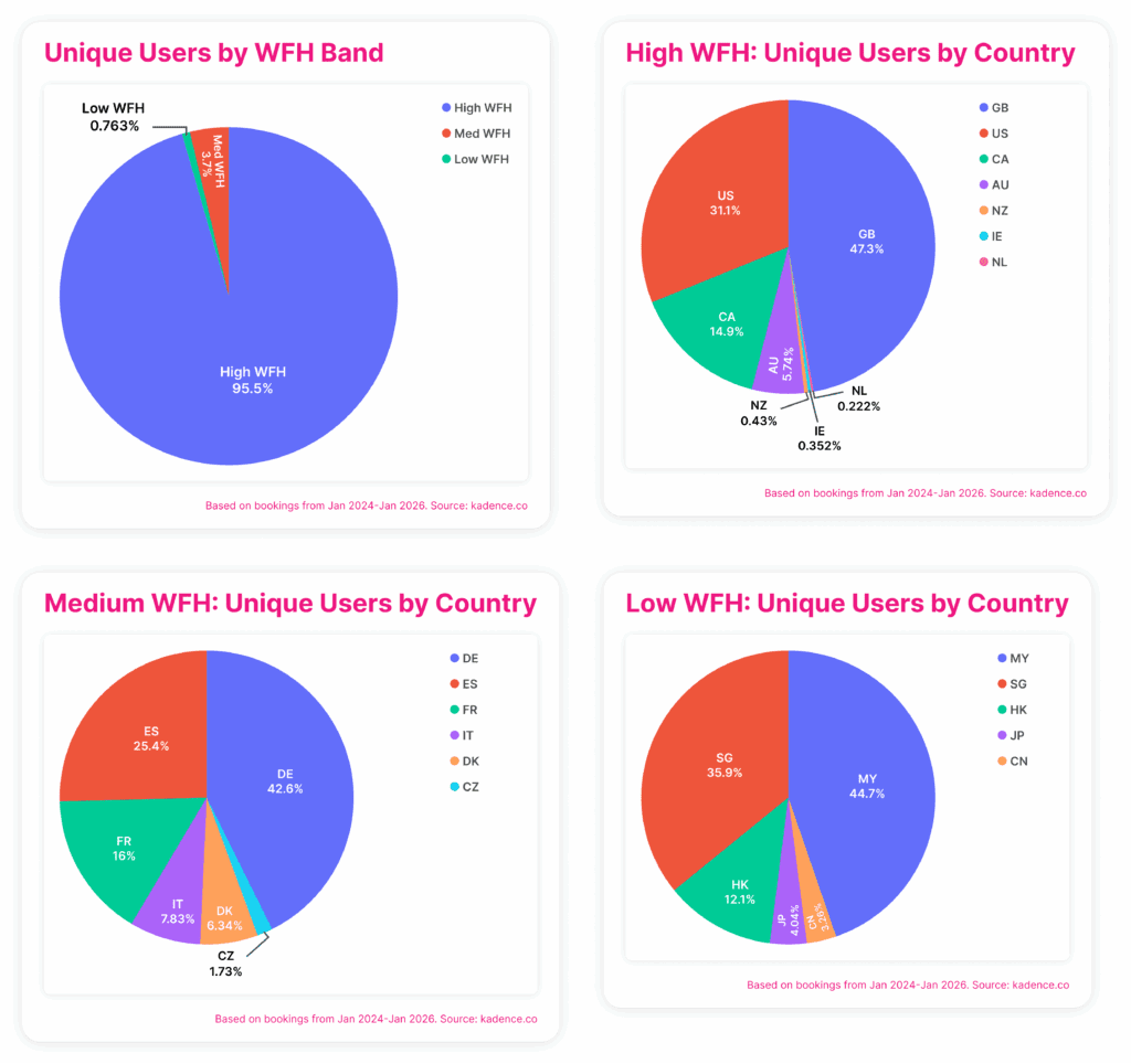 Using those country-level averages as a reference point, I grouped Kadence data into the same three categories. I then limited the analysis to companies with more than 5,000 total bookings and to countries with sufficient booking volume between 2024 and 2026. This helps ensure the patterns reflect stable workplace operations rather than early adoption or policy transition effects.