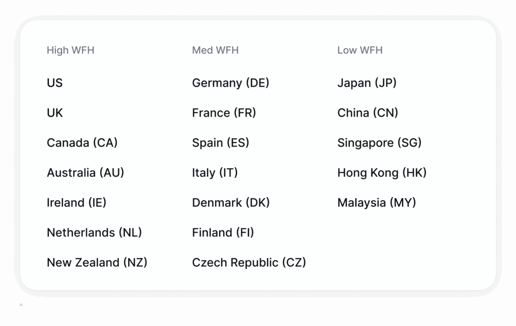 Using that definition, 55 percent of users in high work-from-home countries show a consistent onsite pattern. In medium work-from-home countries, that figure rises to 64 percent. In low work-from-home countries, it reaches 68 percent.