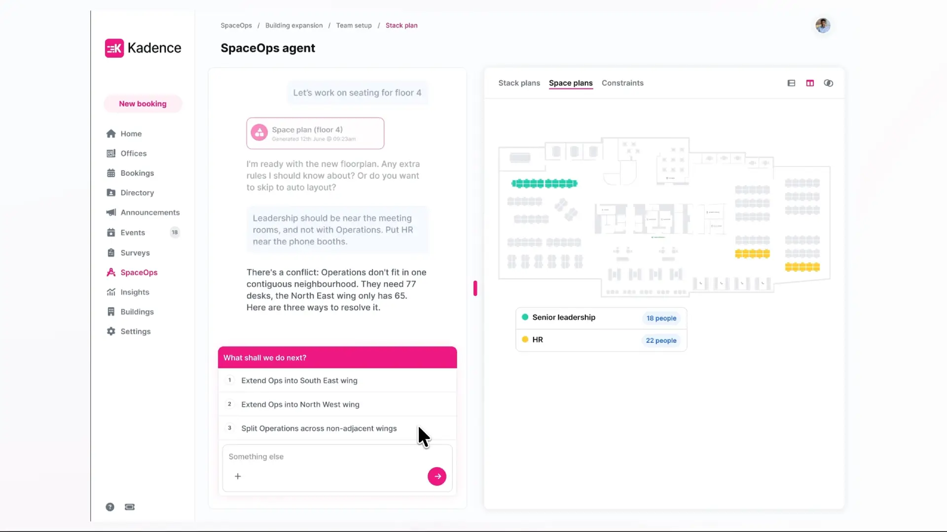 SpaceOps reads your live Kadence WorkOps bookings — not org charts or assumptions — to right-size every team from day one.